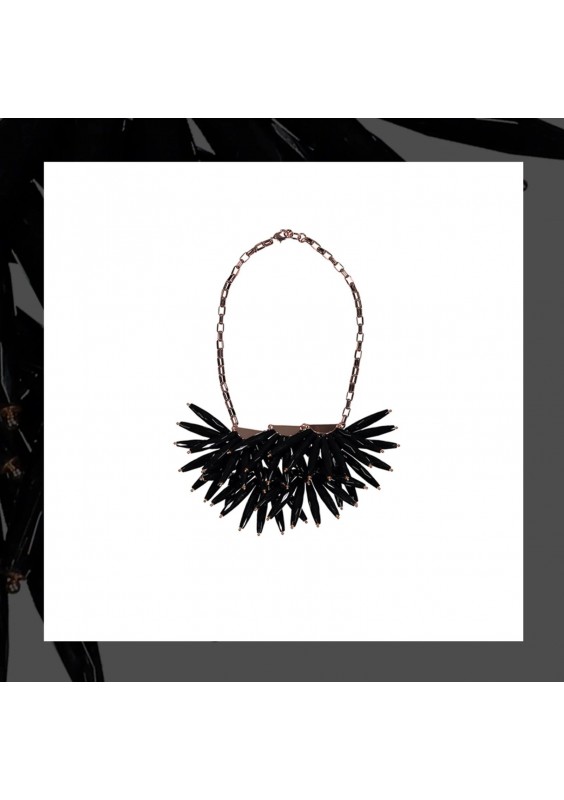 Wyrazisty naszyjnik od marki Ted Baker to biżuteria, która od razu przyciąga uwagę. Wykonany na solidnym łańcuszku w odcieniu różowego złota, zdobiony jest efektownymi, czarnymi kryształami o wydłużonym, szpiczastym kształcie. Elementy te tworzą dynamiczną, trójwymiarową kompozycję przypominającą promienie lub kolce, dzięki czemu naszyjnik prezentuje się niezwykle nowocześnie i odważnie.