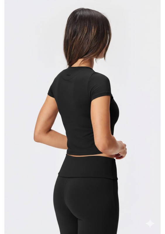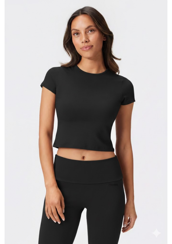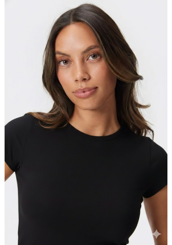 Czarny T-shirt z okrągłym dekoltem Jersey to niezbędny element garderoby. Ma skrócony, dopasowany krój i jest wykonany z oddychającego, elastycznego materiału. T-shirt jest miękki i lekki w dotyku, a przy tym idealny na co dzień, zapewniając wygodę i stylowy wygląd.